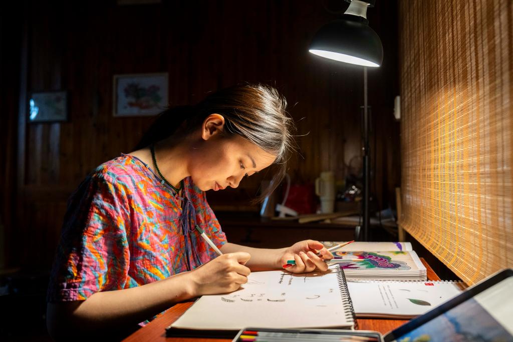 4月15日,在桃源县郑家驿镇梨子岗村齐绘绣庄,肖瑶在整理桃源刺绣针谱。
