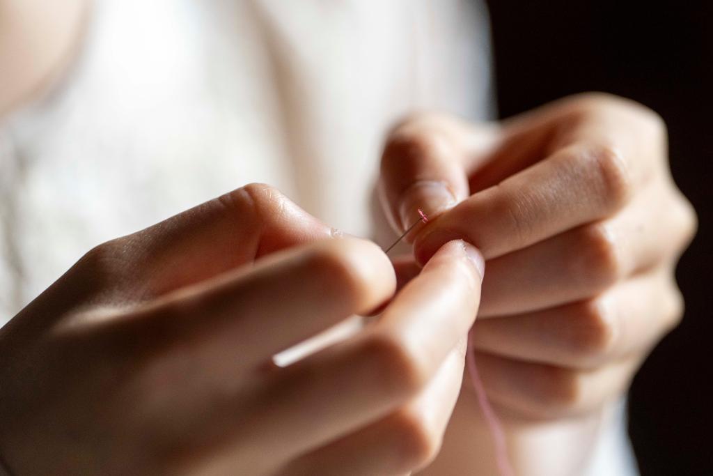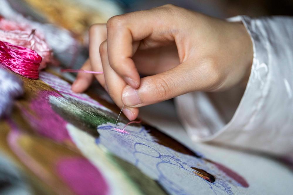 4月16日,在桃源县郑家驿镇梨子岗村齐绘绣庄,肖瑶在穿针引线。