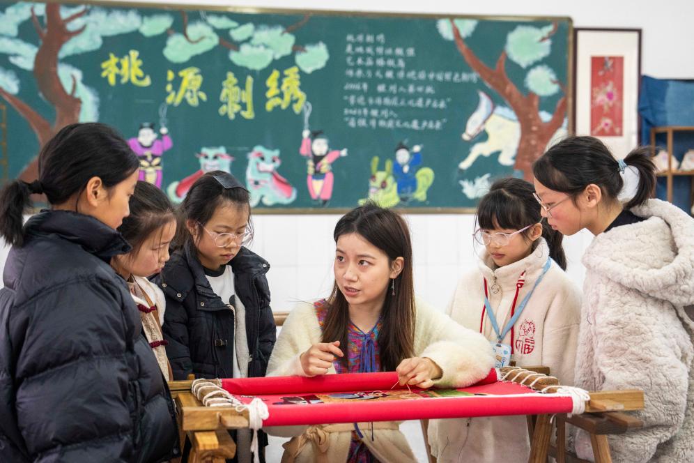 3月6日,在桃源县寺坪中学,肖瑶(右三)在“非遗进校园”课程中给学生讲解刺绣技艺。