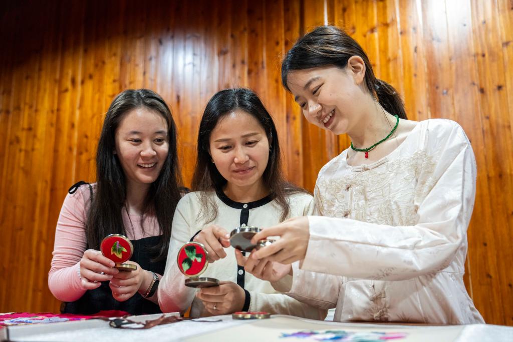 4月16日,在桃源县郑家驿镇梨子岗村齐绘绣庄,肖瑶(右)向游客介绍含有桃源刺绣元素的可折叠化妆镜。