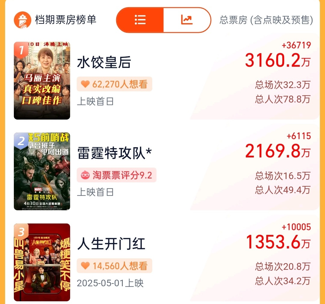 据网络平台,截至4月30日22时05分,2025年五一档新片(含重映)总票房(含点映及预售)突破1亿,影片《水饺皇后》《雷霆特攻队*》《人生开门红》《猎金·游戏》《幽灵公主》《苍茫的天涯是我的爱》暂列前六。
