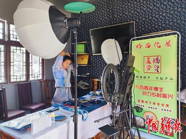 贵州省毕节市黔西市文丽蜡染刺绣非遗工坊带头人杨文丽正在准备直播。中青报·中青网记者 蒋肖斌/摄