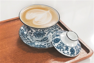在北京王府井工美大厦“予寻京喜”——艺术非遗“中国礼物”旗舰店茶咖休闲区,心形拉花咖啡在青花白底的老北京盖碗中渐渐成型,吸引众多消费者前来打卡。“别小看盖碗这个茶器的作用,”工作人员介绍道,“虽然咖啡还是那个味道,但盖碗衬托出了时光回溯的意境,有点传统,又有点潮流。”越来越多喜爱传统文化的年轻人,爱上这份中西合璧的独特。