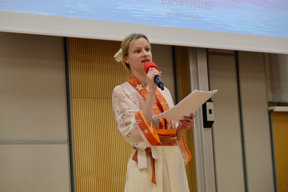 5月22日,一名选手参加在捷克布拉格金融管理大学举行的“汉语桥”世界大学生中文比赛捷克赛区决赛。