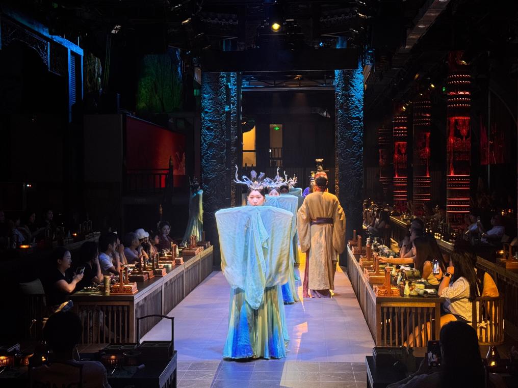 在精心打造的古代宴饮场景中,化身“宫人”的工作人员执礼而行;食客换上汉服,一边用餐,一边在变幻光影间欣赏着从春秋战国到明清时期的文化表演,时序更替巧妙地融入了餐饮流程。