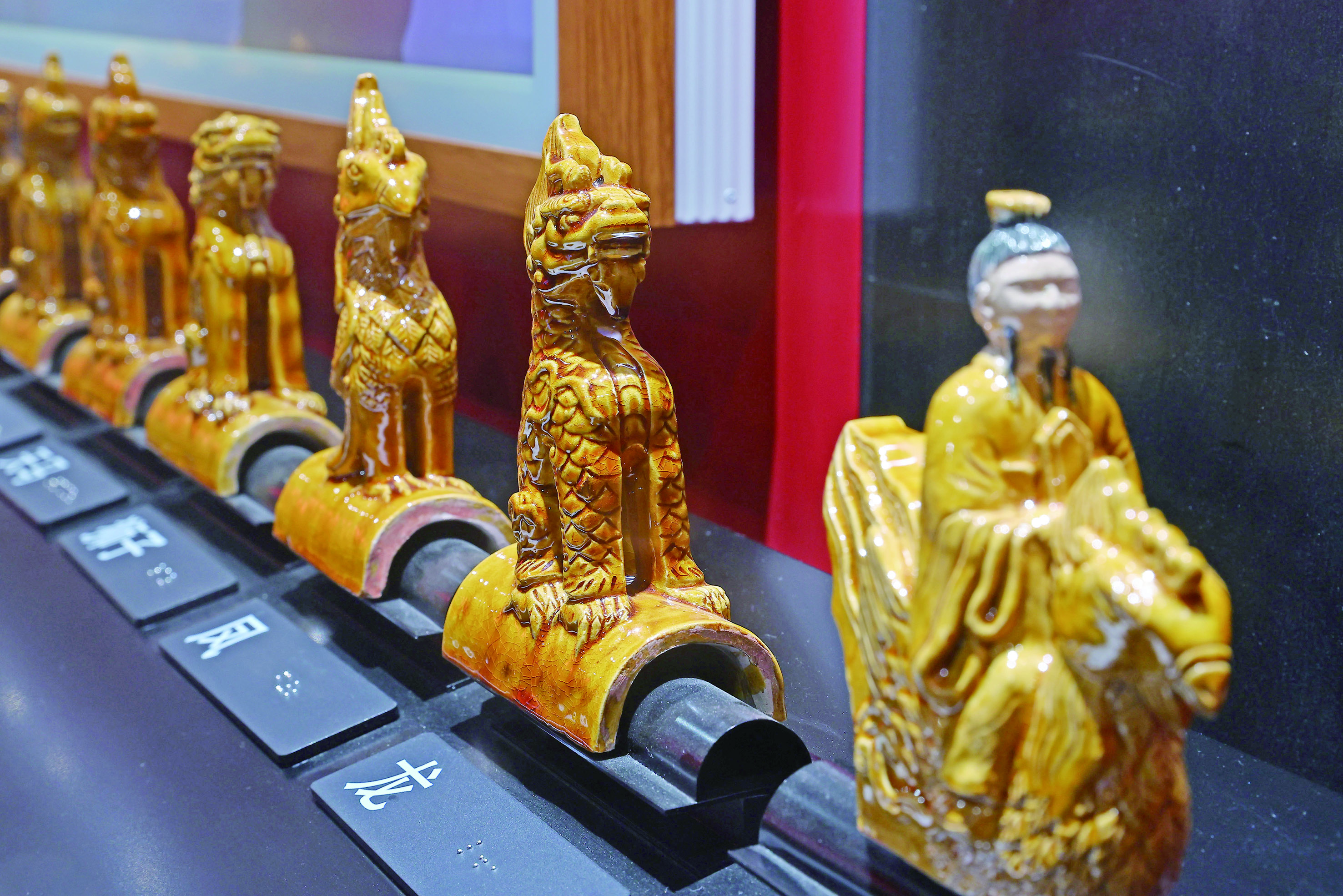 故宫文创融合馆里陈列的太和殿脊兽、琉璃正吻等古建筑构件的等比例复制品