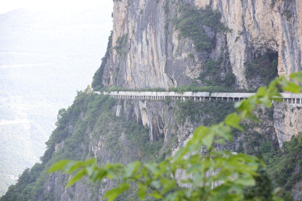 从远处看,水渠犹如一条镶嵌在绝壁上的绿带,仿佛人间“天河”。跟随谭祖顺踏上石板路渠岸,沿着渠道逆流而上,一侧是清流汩汩,一侧是悬崖如削。