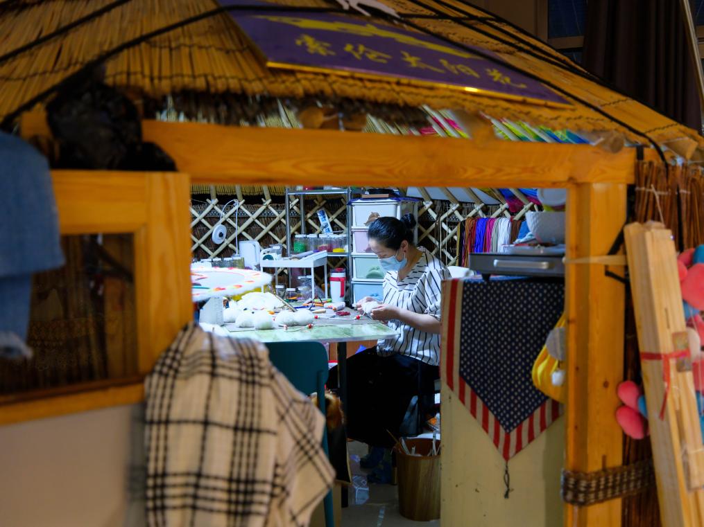 7月9日,在内蒙古呼伦贝尔市鄂温克族自治旗辉苏木,工作人员在“伊德喜”夜市上手工制作鄂温克族传统手工艺品“太阳花”。