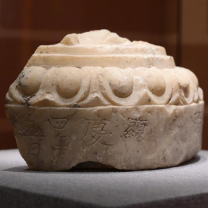 这是一件刻有“显庆四年五月”字样的唐代汉白玉莲花座残件(7月28日摄)。