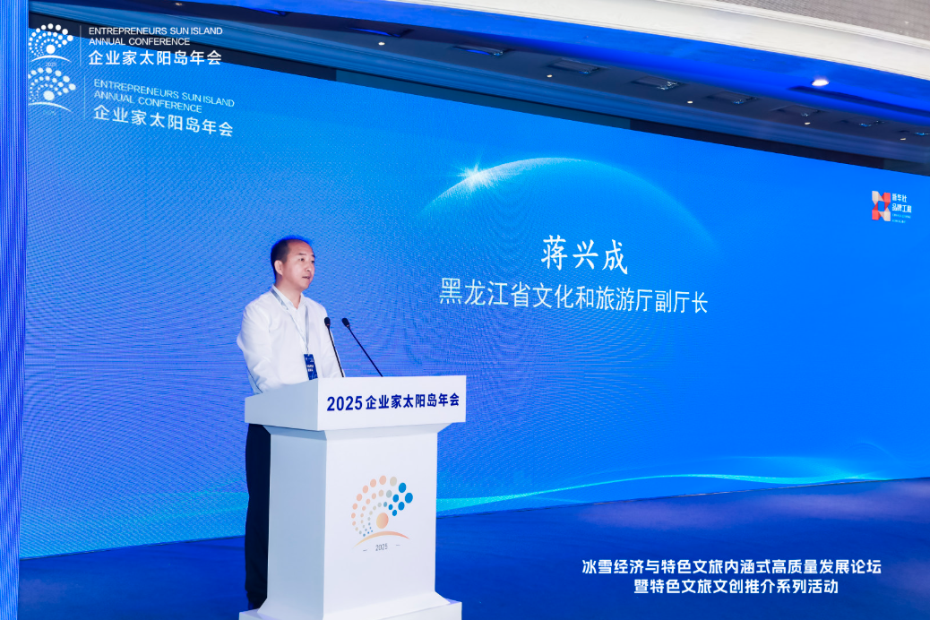 8月2日,2025太阳岛企业家年会“冰雪赋能发展 文旅创引未来”冰雪经济与特色文旅内涵式高质量发展论坛在哈尔滨举行。图为黑龙江省文化和旅游厅副厅长蒋兴成致辞