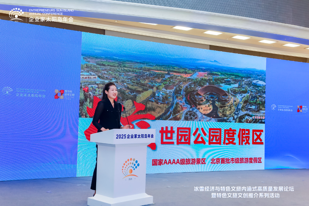 8月2日,2025太阳岛企业家年会“冰雪赋能发展 文旅创引未来”冰雪经济与特色文旅内涵式高质量发展论坛在哈尔滨举行。图为北京世园投资发展有限责任公司张潇潇作特色文旅推介