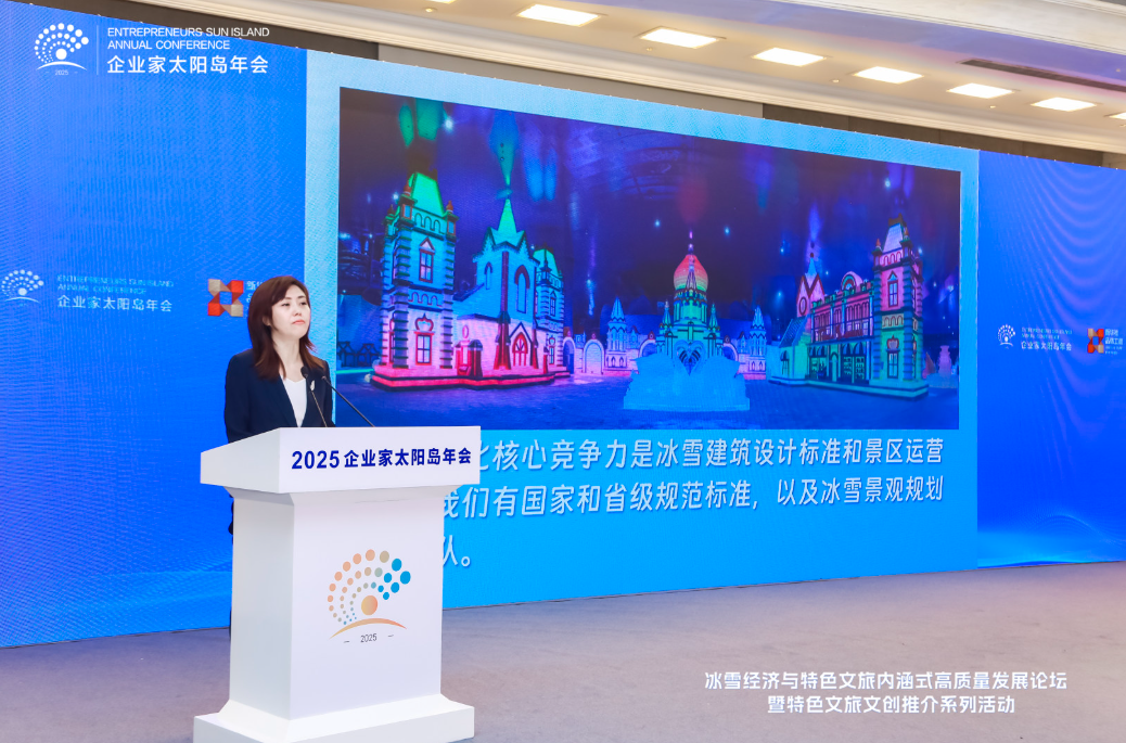 8月2日,2025太阳岛企业家年会“冰雪赋能发展 文旅创引未来”冰雪经济与特色文旅内涵式高质量发展论坛在哈尔滨举行。图为轩辕集团大项目中心总经理邢淑杰发表演讲