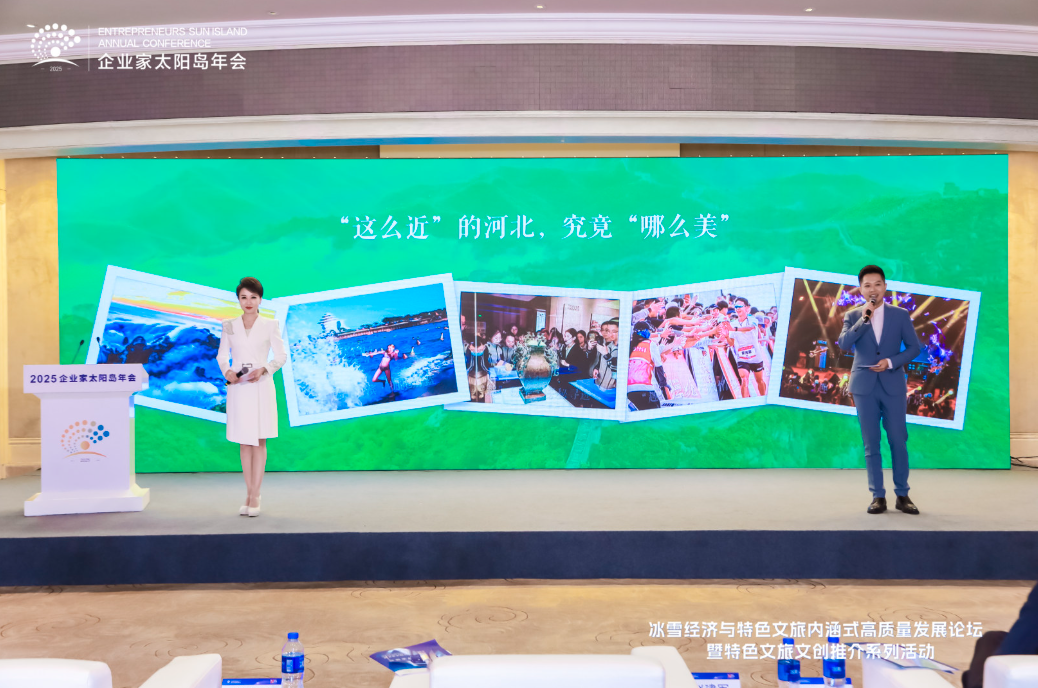 8月2日,2025太阳岛企业家年会“冰雪赋能发展 文旅创引未来”冰雪经济与特色文旅内涵式高质量发展论坛在哈尔滨举行。图为河北省广播电视台主持人乐彤、杨旭作河北省重点文旅城市推介