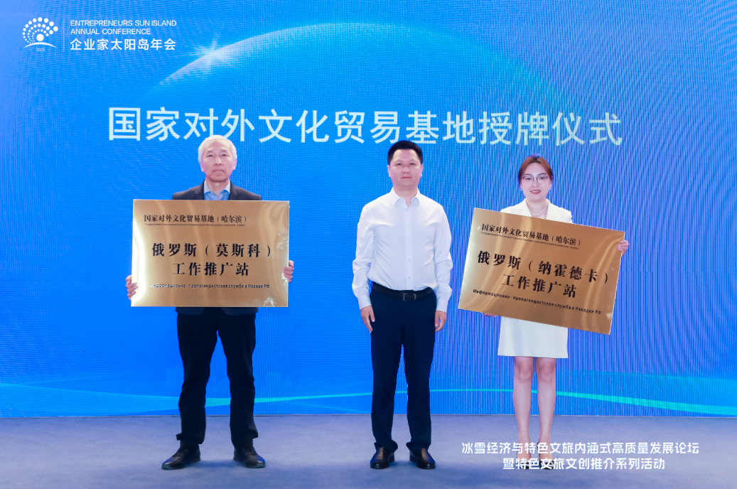 图为哈尔滨市文化广电和旅游局局长王洪新为轩辕集团驻俄罗斯联邦纳霍德卡市工作处、轩辕集团驻俄罗斯联邦莫斯科市工作处授牌