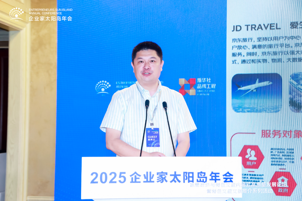 8月2日,2025太阳岛企业家年会“冰雪赋能发展 文旅创引未来”冰雪经济与特色文旅内涵式高质量发展论坛在哈尔滨举行。图为京东酒旅业务总经理张锐演讲