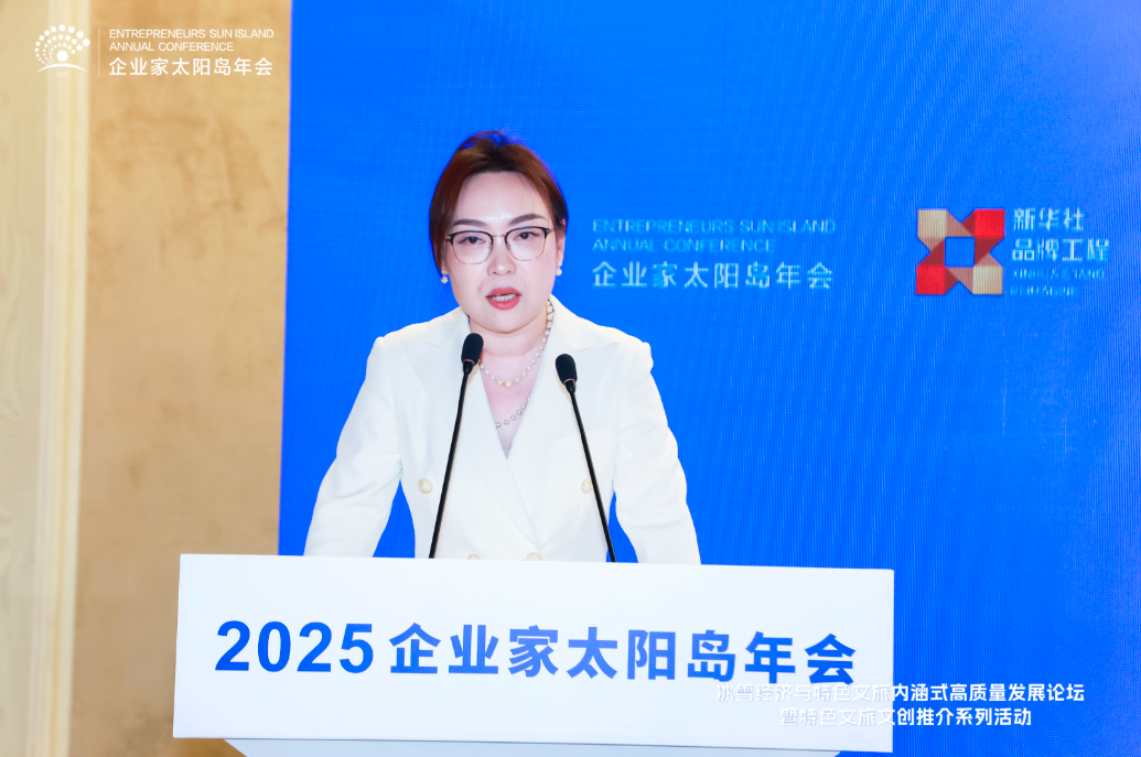 8月2日,2025太阳岛企业家年会“冰雪赋能发展 文旅创引未来”冰雪经济与特色文旅内涵式高质量发展论坛在哈尔滨举行。图为哈尔滨马迭尔文化旅游投资集团有限公司党委副书记、副总经理秦晓燕发表演讲