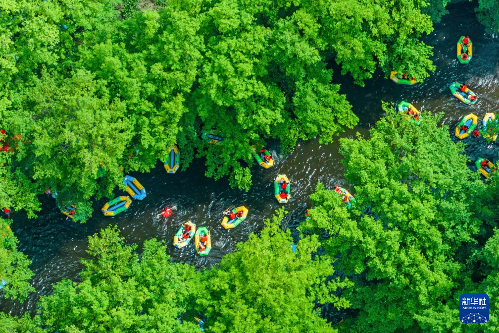 游客在滁州市皇甫山国家森林公园漂流(2024年5月19日摄,无人机照片)。新华社发(计成军 摄)
