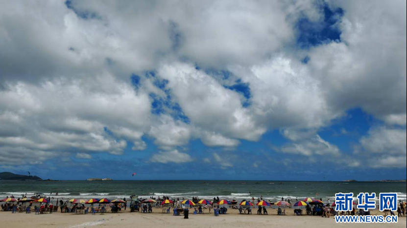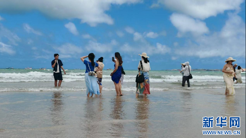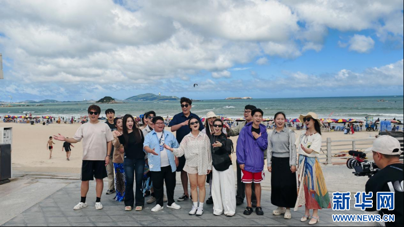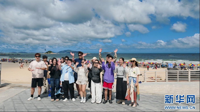 广西艺术学院青年合唱团成员打卡平潭龙王头海滨浴场。新华网 刘丰 摄