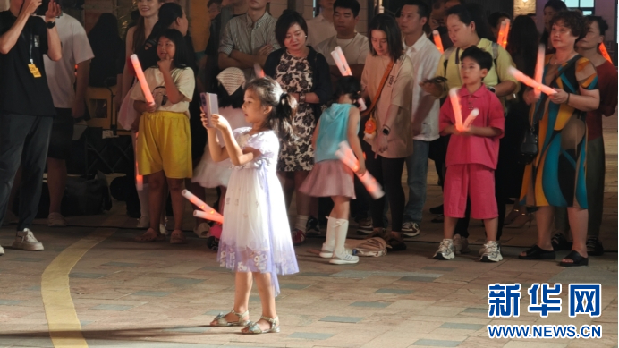 市集舞台歌声正浓,一名小女孩拿着手机冲出人群,对准喜欢的乐团拍摄起来。新华网刘默涵摄
