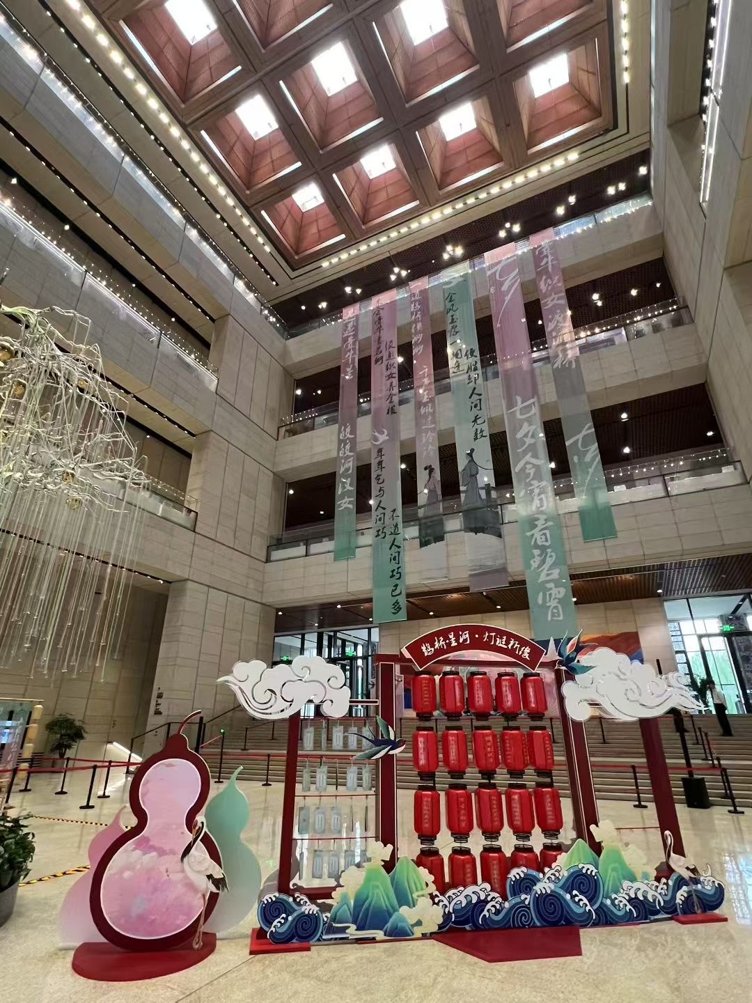 当天,步入中央大厅,只见“牛郎”“织女”“月老”等身着剪裁精致的传统服饰,以沉浸式情景演绎再现“鹊桥相会”的经典传说。“月老”互动环节,猜七夕灯谜、对古典诗词,观众绞尽脑汁、踊跃参与,在趣味互动中品读传统文化韵味。
