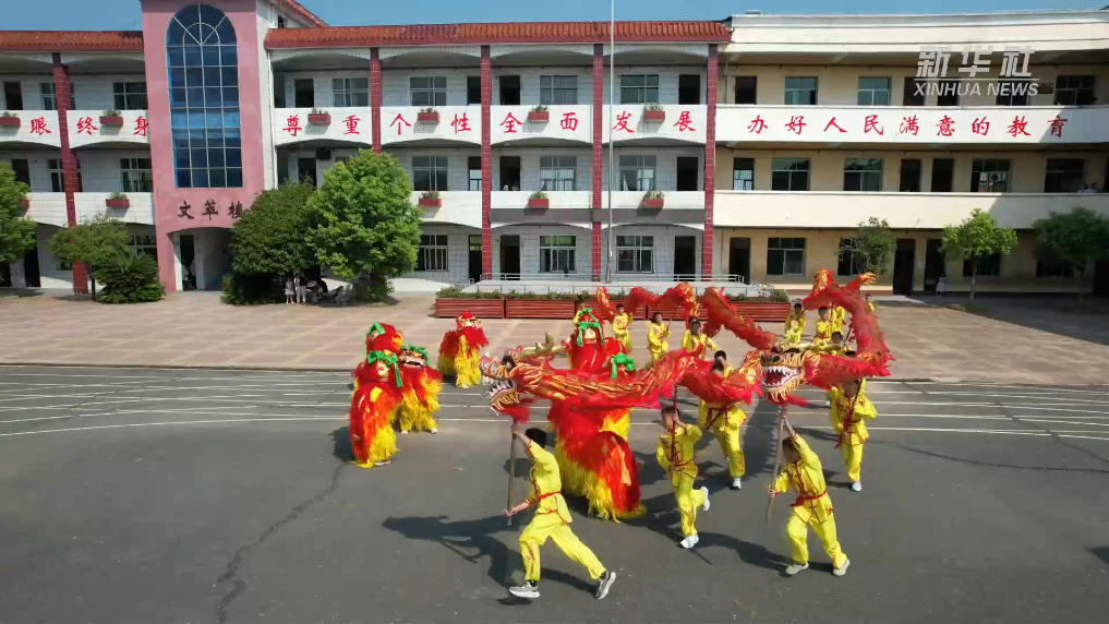 8月31日,江西省吉安市泰和县万合中心小学的校园里锣鼓喧天、热闹非凡。新生报到当天,一场融合了省级非遗“华盖双狮舞”与传统舞龙的表演正在上演。