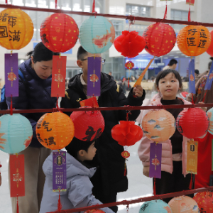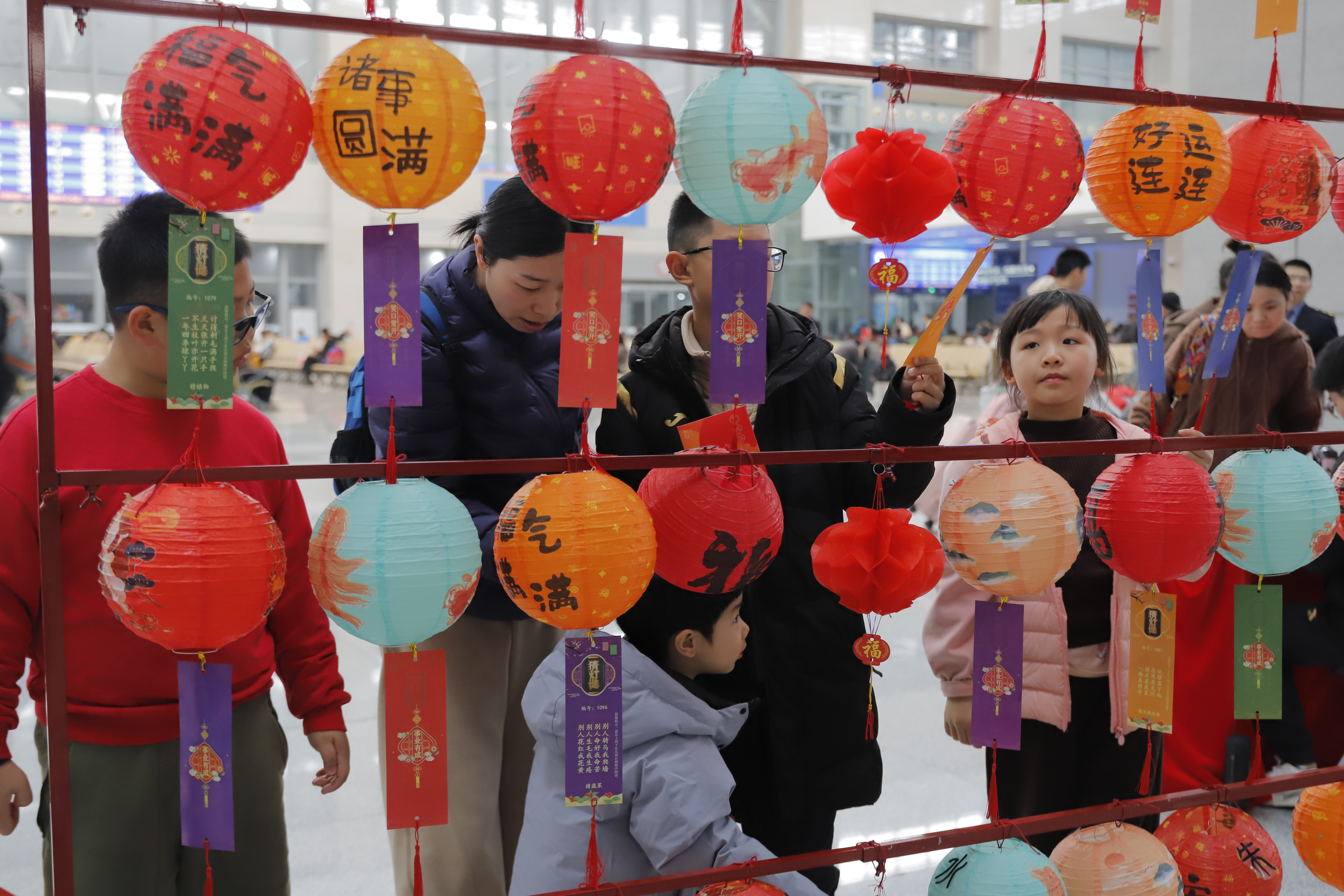 福州南站举办“话百家姓、过中国年”主题文化活动。图为旅客体验猜灯谜送好礼。赖啸云摄