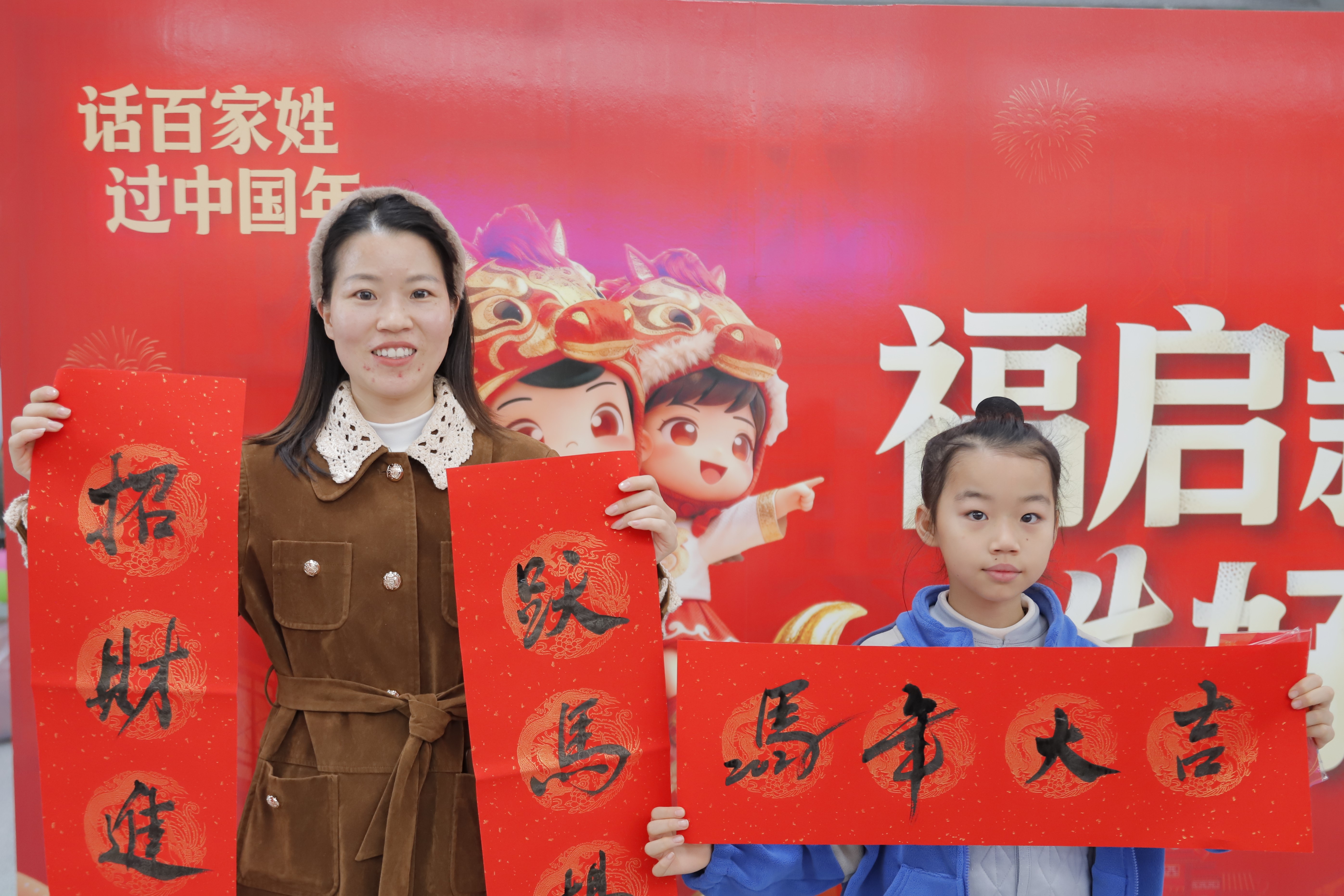 “这副春联寓意真好!我要了!”活动现场还邀请书法家挥毫泼墨,围绕马年生肖与“姓”福主题创作春联与福字,并根据旅客需求免费定制、赠送。“‘日日财源顺意来,年年福禄随春到’,这副对联是我女儿刚写的,真好看!”来自东北的李女士兴奋地说道。
