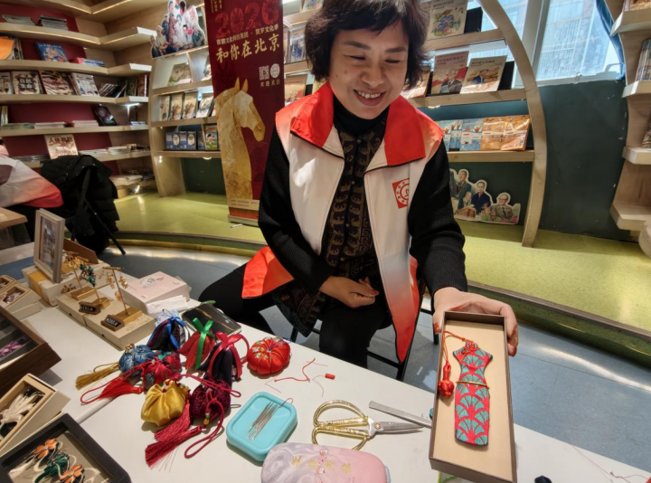 杜静,铜胎掐丝珐琅(景泰蓝)传承人,师从北京市工艺美术大师、张氏珐琅第三代传人张玉安先生将非遗文创产品带进书店。