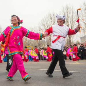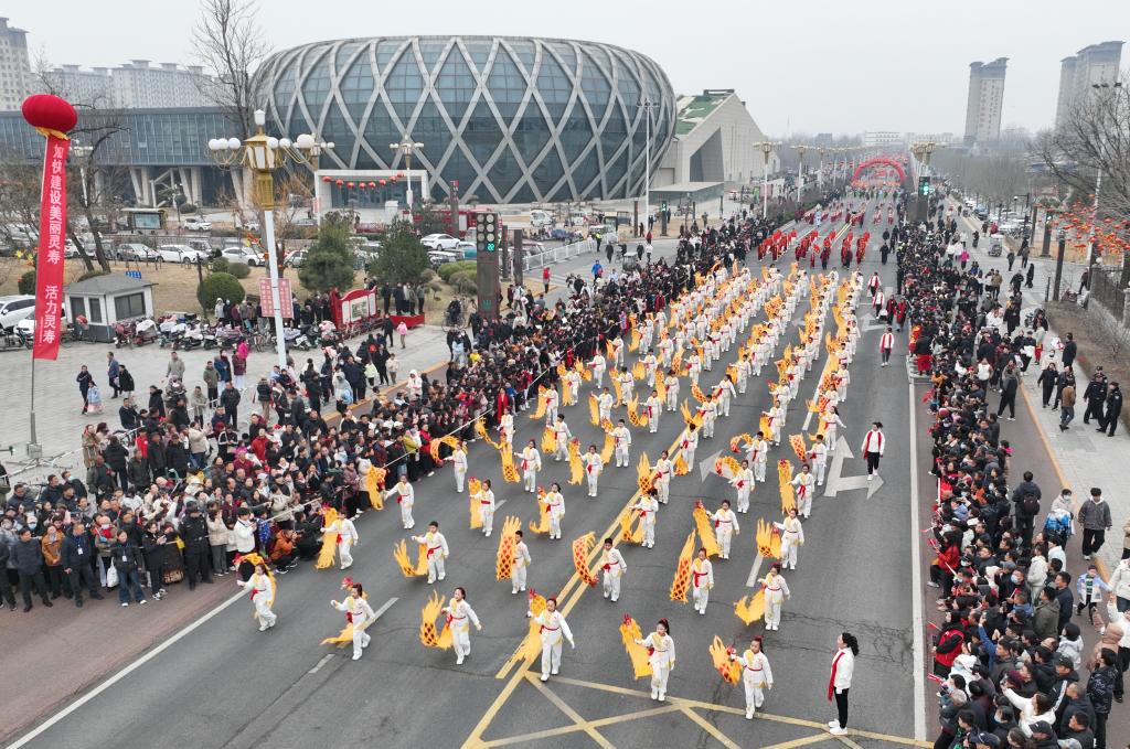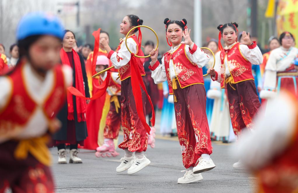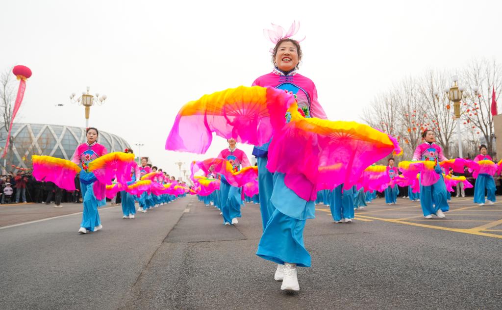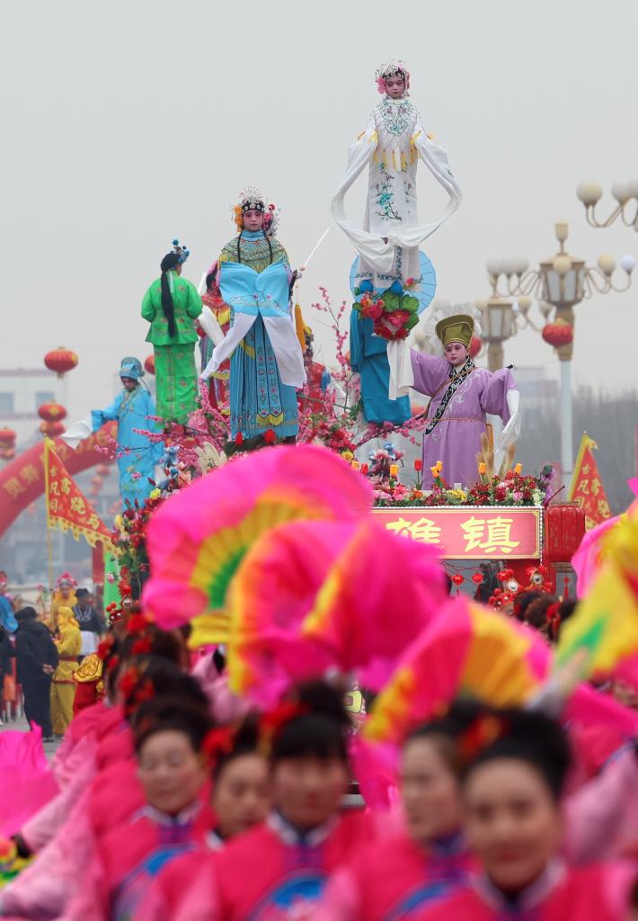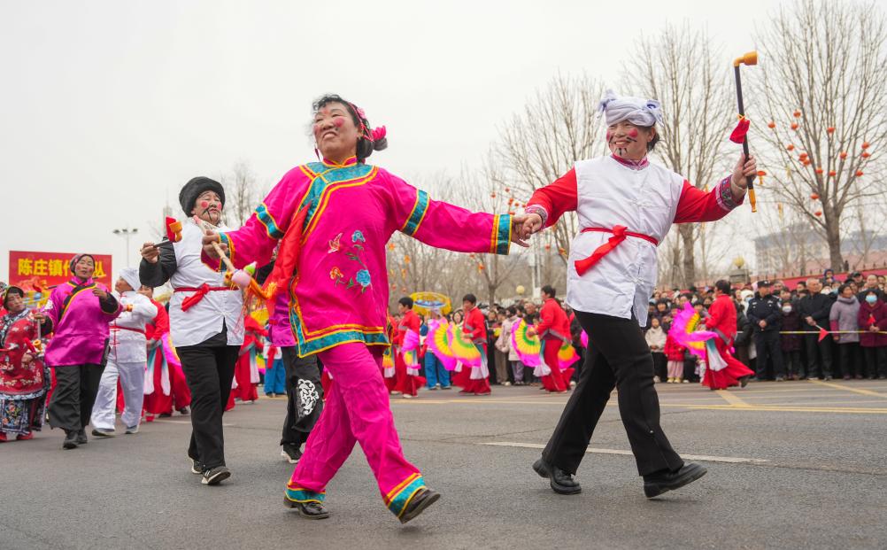 2月26日,人们在河北省灵寿县2026年新春民间艺术巡游展演活动中表演秧歌。
