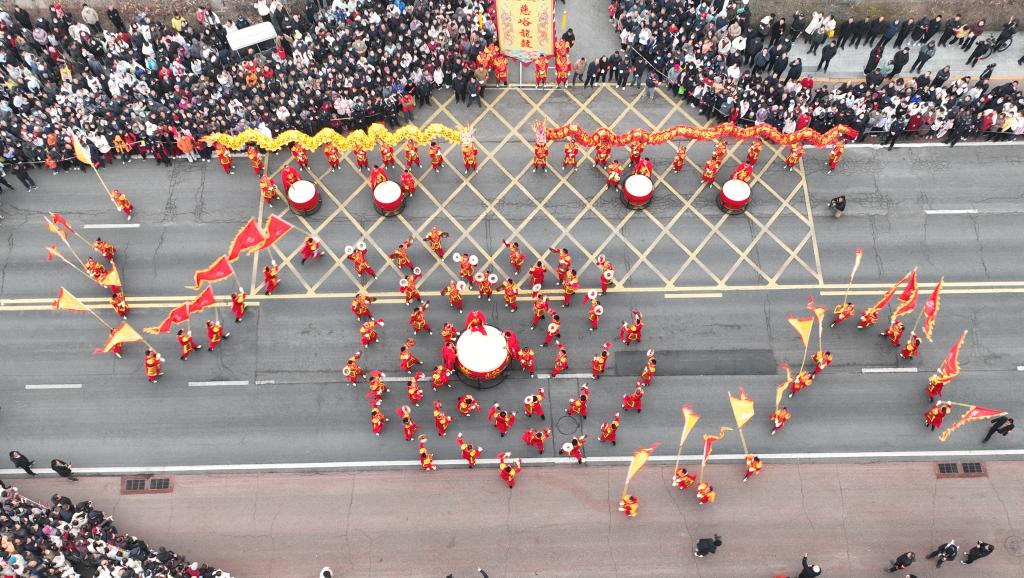 2月26日,民俗艺人在河北省灵寿县2026年新春民间艺术巡游展演活动中进行慈峪龙鼓表演(无人机照片)。