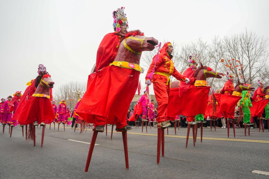 2月26日,民俗艺人在河北省灵寿县2026年新春民间艺术巡游展演活动中进行高跷马表演。