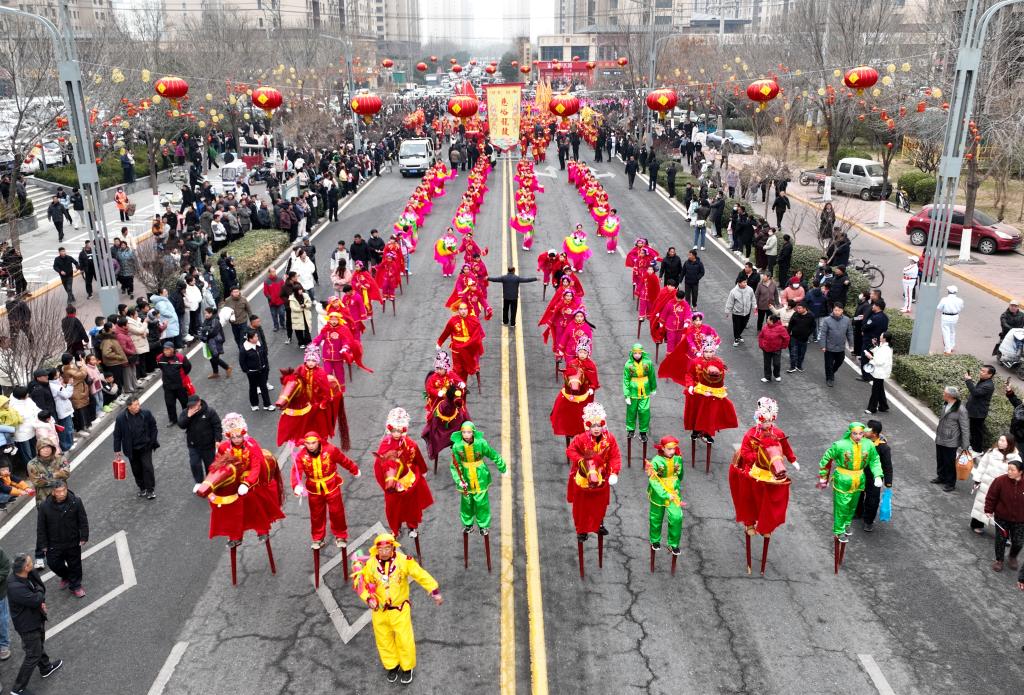 2月26日,民俗艺人在河北省灵寿县2026年新春民间艺术巡游展演活动中表演踩高跷(无人机照片)。