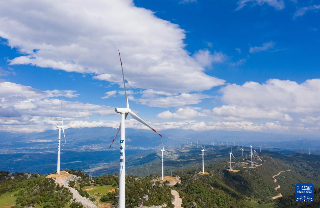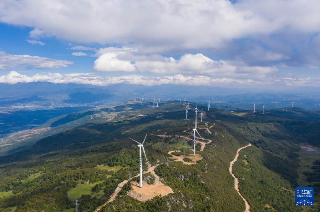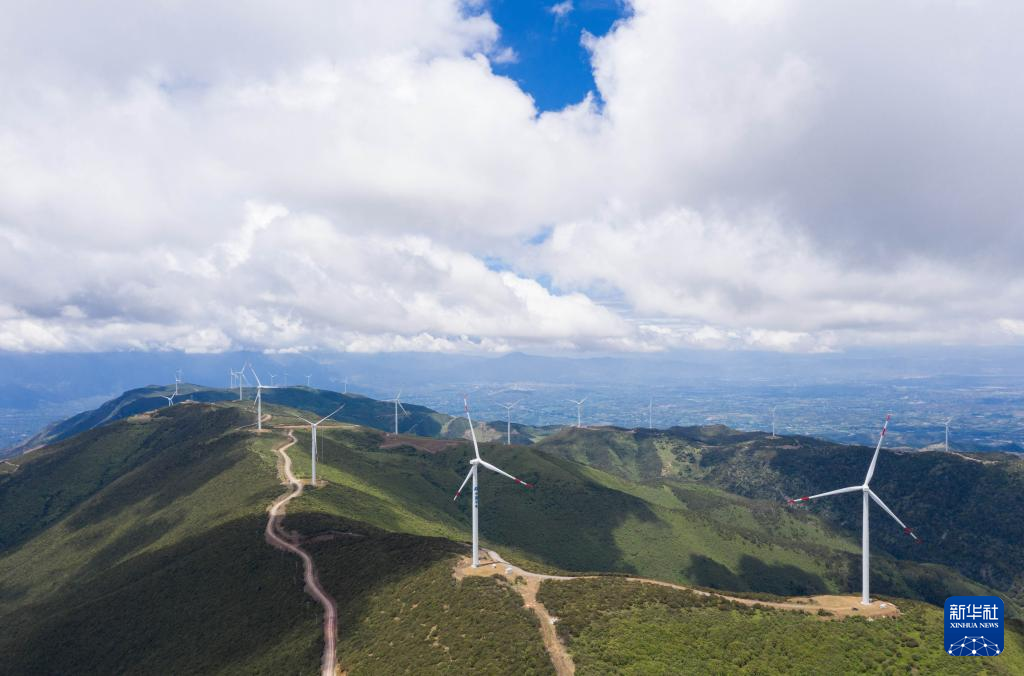 这是位于四川盐源县棉桠镇的四川盐源华电新能源有限公司的凉风坳风电场一角(6月20日摄,无人机照片)。