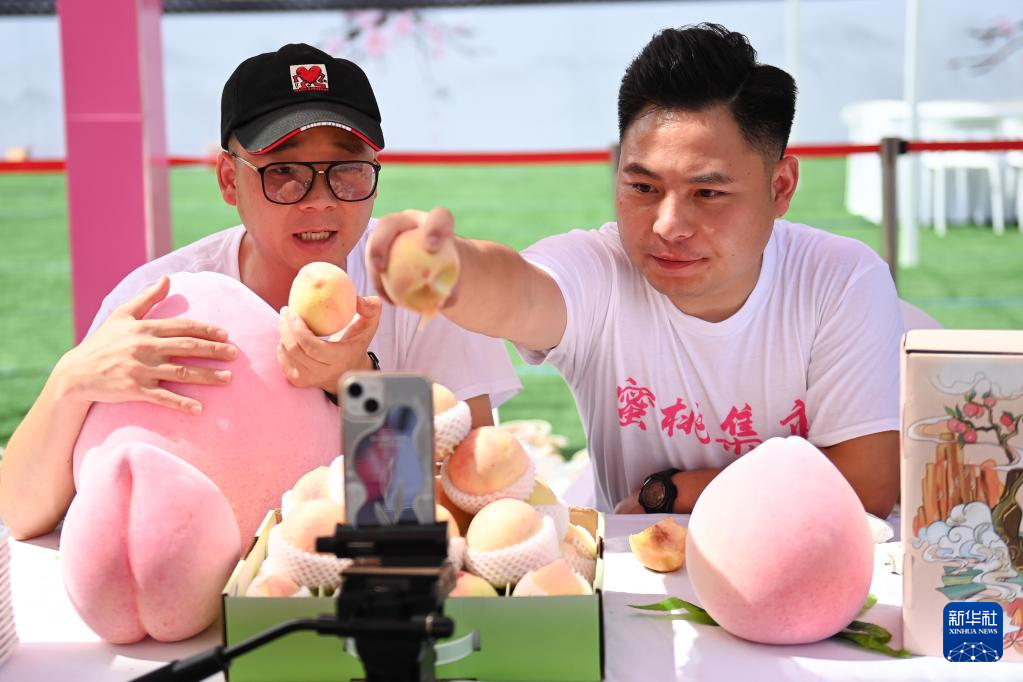 7月3日,在浙江省宁波市奉化区溪口镇蜜桃集市上,销售人员通过直播带货推介水蜜桃。