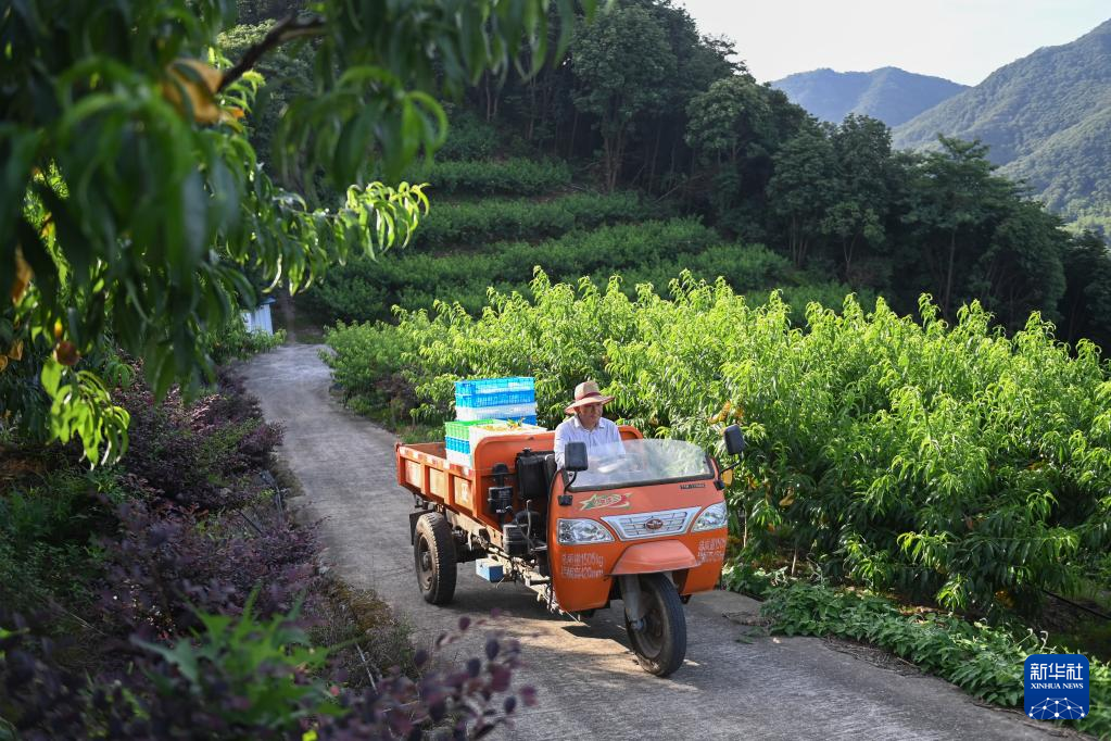7月3日,浙江省宁波市奉化区锦屏街道外应村九岙水蜜桃果园的果农将刚采摘的水蜜桃运出。