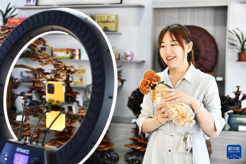 7月9日,在冠县店子镇,主播在进行灵芝直播带货。
