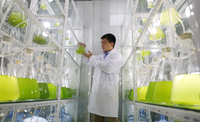 德州地福来生物科技有限公司科研人员在试验室观察藻类活性细胞的生长状态。