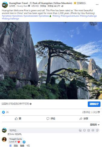 黄山旅游在Facebook、Instagram和Twitter账号三大海媒帐号都进行了黄山松的图文报道,向海外游客展示了黄山美景与徽州文化。