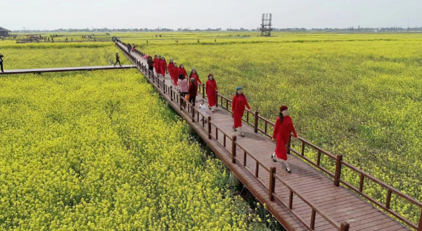 “一沐春风万顷黄,油菜花开满地金。”走进联圩镇,丰产河两岸一派田园风光。每年春天,河边数万亩连片油菜花迎春绽放,金灿灿的花海把乡村点缀得异常美丽。远远望去,一片又一片的油菜花,像金黄的地毯铺满一地,伴随习习春风,那油菜花海不时泛起层层金色涟漪,令人心驰神往。徜徉油菜花海间,花潮迎人流,人随花潮行,那满目金色,让人赏心悦目。春风吹来,花香氤氲,沁人心脾。