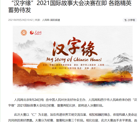作品简介:2021年10月12日,由中国人民对外友好协会主办,西宁市人民政府、人民网承办的“汉字缘”2021国际故事大会决赛在西宁成功举办。