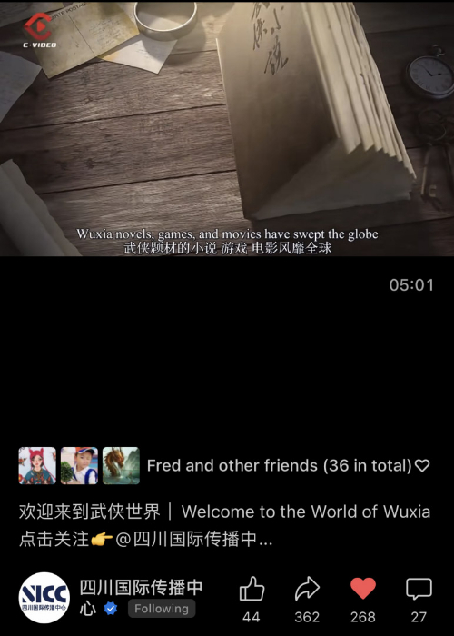 作品简介:《欢迎来到武侠世界|Welcome to the World of Wuxia》由四川国际传播中心策划、拍摄、制作以及推广,以外国人对中国武侠的好奇以及近期在外网有极高热度的中国小说为切入点,邀请四川峨眉武术峨眉山市级非遗传承人马赵凌云的师弟阳晨(原名易志刚)以及峨眉武术国家级非遗传承人王超参与拍摄,以“武林中人”的身份为年轻人讲述武术背后的故事。