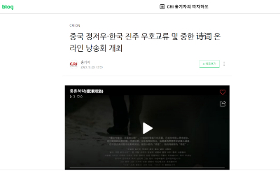 作品简介:2021年9月28日上午,“中韩文化交流年——中国郑州·韩国晋州友好交流暨中韩诗词线上朗诵会”活动在中国郑州市和韩国晋州市同步举行。此次活动由郑州市人民政府、晋州市政府主办,郑州市人民政府外事办公室、郑州市文化广电和旅游局、晋州市经济通商局承办,旨在弘扬传统文化,扩大两市人文交流交往,共同谱写两市友好交往新篇章。国际在线对“中国郑州·韩国晋州友好交流暨中韩诗词线上朗诵会”进行了中韩双语直播、多语种传播、通栏广告推广、宣传海报制作发布等多形式、多渠道、融媒体的国际传播。