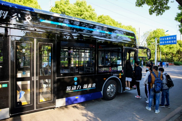 4月18日下午4点多,一辆135路公交车驶进银河路加氢站。工作人员蒋鑫见状立马来到加氢点旁,熟练地拿起防静电设备夹在公交车上,随后将加氢枪插进公交车储氢设备内开始加氢气。蒋鑫说,该站具备每日1000千克的加氢能力。按每辆公交车每日20千克加氢量计算,可满足50辆公交车每日的加氢需求。