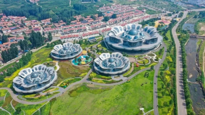 走进山东省沂水县泉庄镇尹家峪田园综合体,5朵不同形态的桃花温室在青山绿树间华美绽放,在这里不仅可以休闲玩乐、品尝特色餐饮,还可以亲身体验航天员训练科目、感受生态循环农业技术,这个山东省首批田园综合体试点项目是沂水县生态、生产、生活“三生同步”的生动写照。