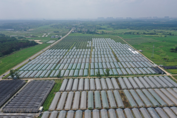 盛夏时节,航拍无人机飞过江西力源农业科技开发有限公司(以下称江西力源农业)种植基地,一列列蔬菜大棚“镶嵌”在大地上,整齐划一,蔚为壮观。