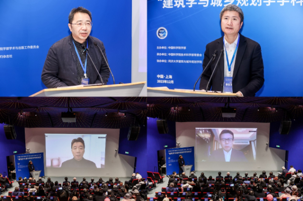 中国科学院段进院士(上左),中国建筑学会李存东秘书长(上右),中国工程院庄惟敏院士(下左),中国工程院李兴钢院士发表致辞(下右)