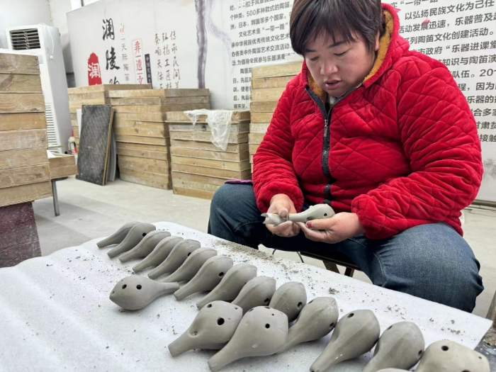2月14日,春节假期,陶笛技师仍在加班赶制订单。