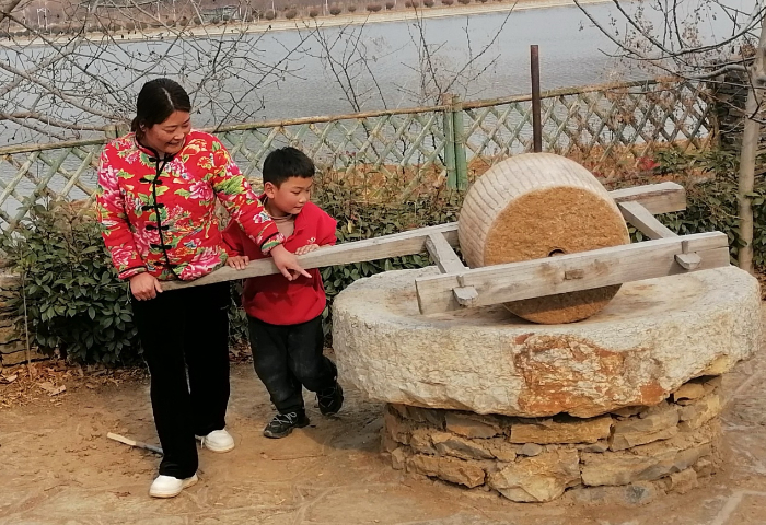 “你要双手抓住碾棍,抬平,然后身体用力向前,一圈圈地推”。在山东省兰陵县下村乡上村村的农耕广场,一位返乡过年的妈妈在认真地给城里长大的儿子演示如何推石碾,和孩子一起重温儿时的记忆。