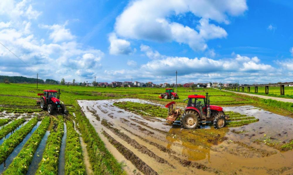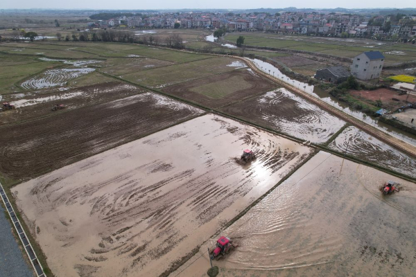 位于江西省上饶市鄱阳县游城乡花桥村的优质稻基地里,农户驾驶着农业机械在田间来回穿梭,为早稻田地“舒筋活络”,“安眠”了一个冬天的土地瞬间焕发出新活力。(余莉)