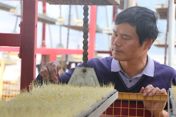 江西上栗县桐木镇种粮大户张祖权在机械化育苗中心查看秧苗长势。该批秧苗约五千盘,可提供农户种植早稻200余亩。 (李丽)